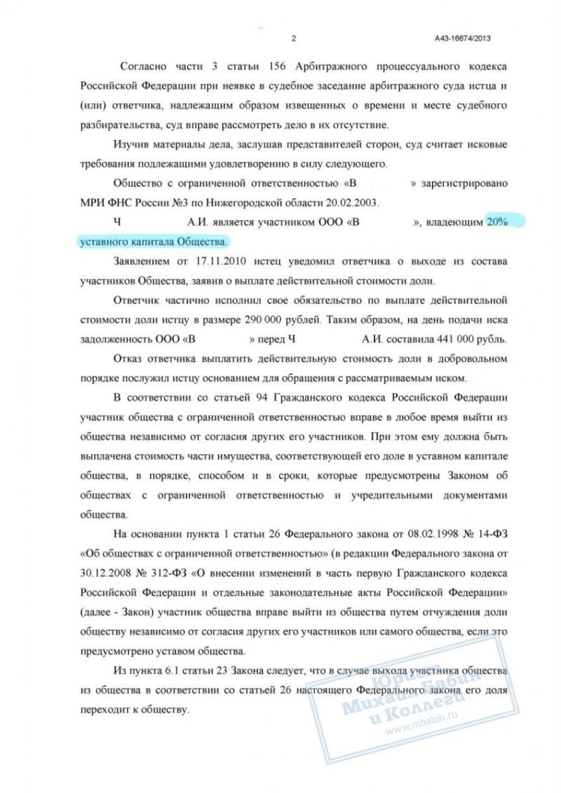 Гражданин Ч., являясь участником ООО «В», обладал 20% уставного капитала названной организации. Желая выйти из нее, Ч. потребовал отдать ему его долю денежных средств, но получил только 290 000 руб. — треть от суммы, на которую претендовал.
