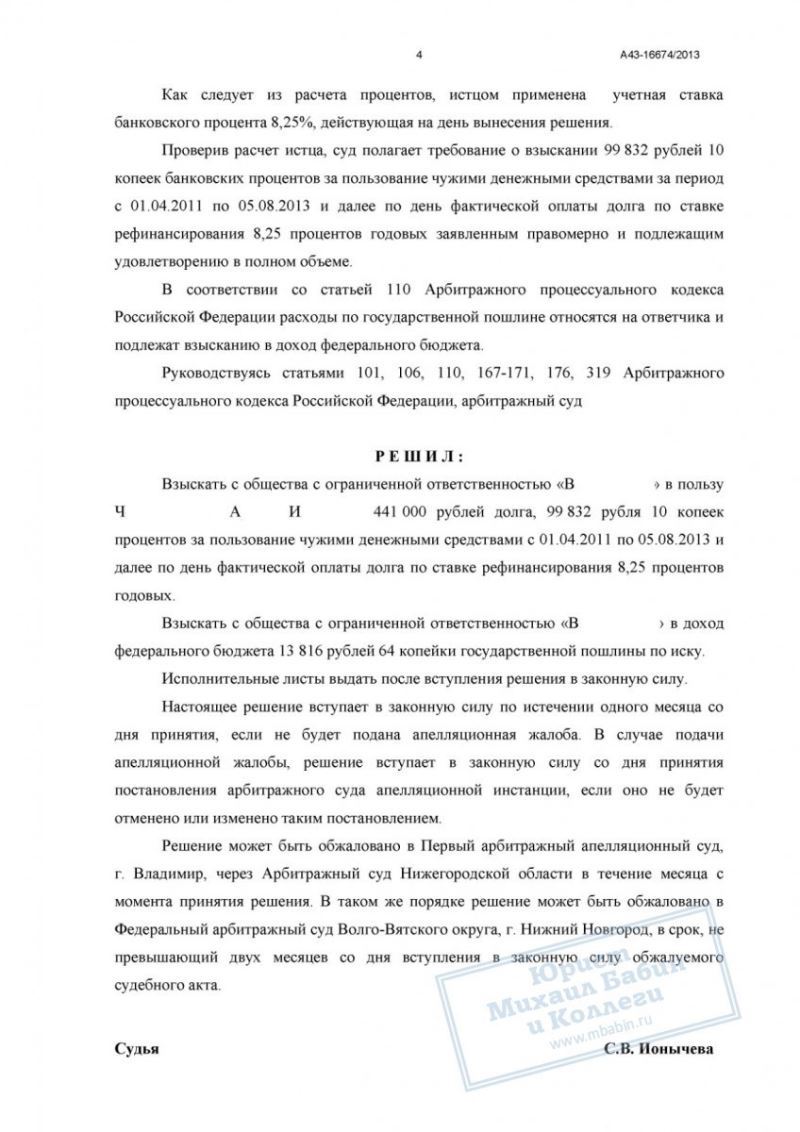 Ч. обратился в арбитражный суд, где при поддержке нашего юриста смог добиться справедливости. Суд обязал ООО «В» выплатить всю оставшуюся сумму долга и 100.000 руб. процентов за пользование чужими деньгами — всего 540.000 руб.