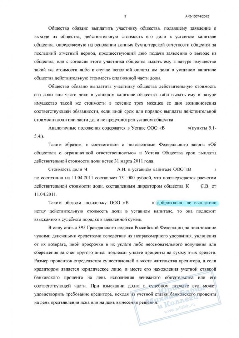 • Обязали организацию выплатить клиенту его долю капитала с процентами