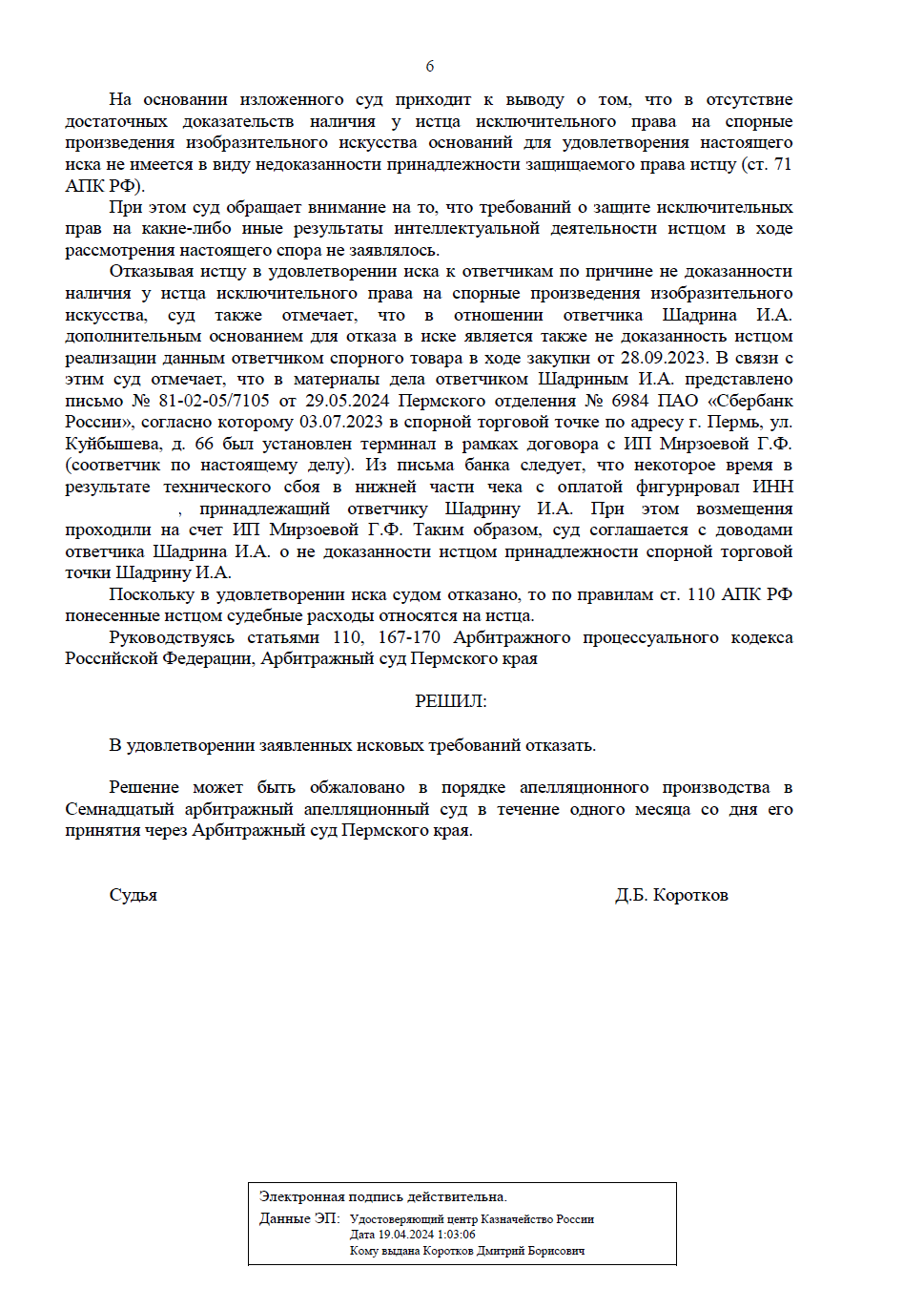 Арбитражный суд Пермского края в полном объёме отказал в удовлетворении исковых требований. В компенсации и возмещении судебных расходов истцу было отказано. Все претензии к нашему клиенту были сняты.