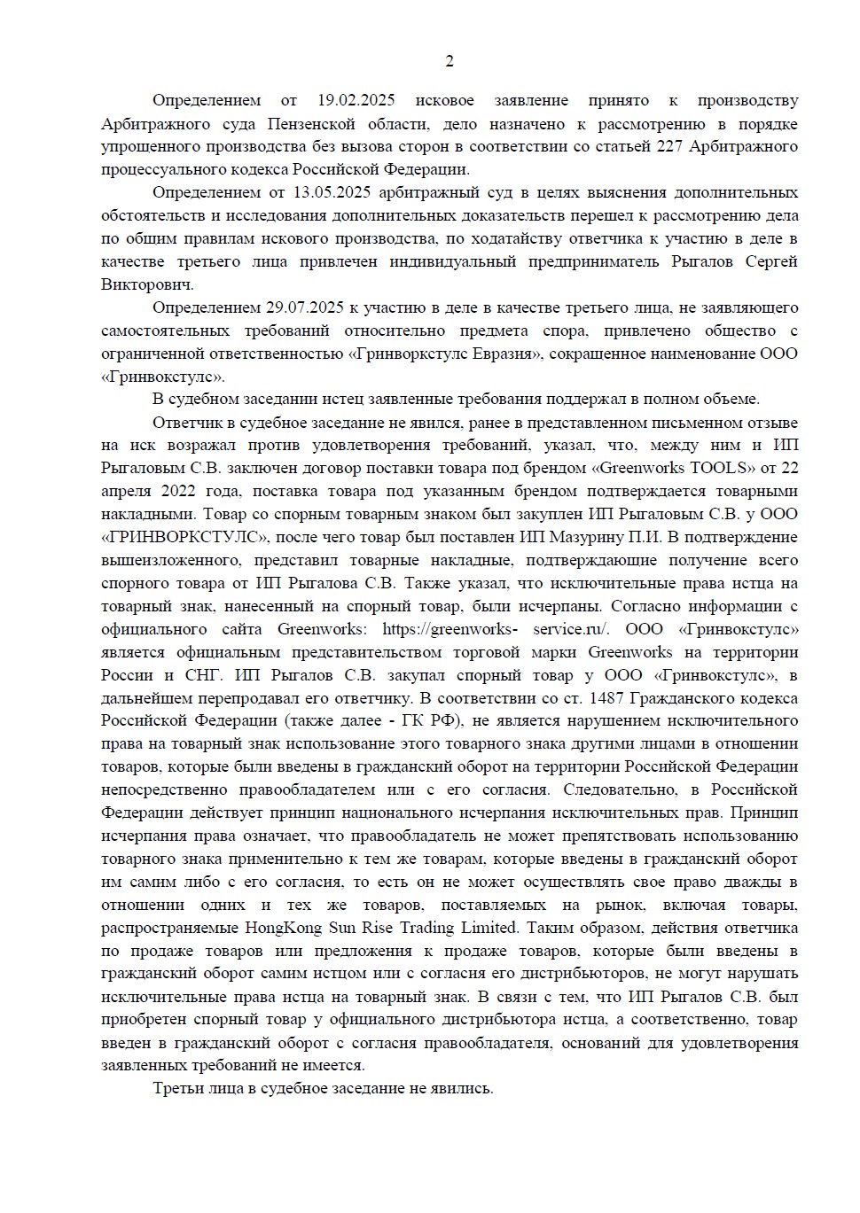 Правообладатель товарного знака «Greenworks» требовал компенсацию за продажу инструмента на Wildberries. Юристам «Оригинальное решение» удалось доказать, что товар является оригинальным и был введен в оборот с согласия самого правообладателя через цепочку официальных дистрибьюторов. Суд полностью отказал иностранной компании в иске.