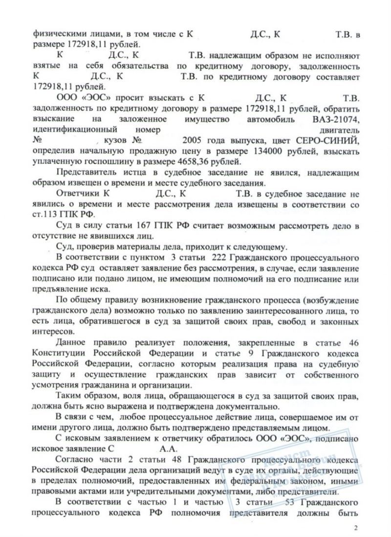 Коллекторское агентство "ЭОС" обратилось с иском к супругам К. о взыскании долга по кредиту и обращении данного взыскания на их личный автомобиль. Юрист нашей компании внимательнейшим образом исследовал документы, предложенные агентством для судебного заседания. Им были выявлены несоответствия документов требованиям действующего законодательства.