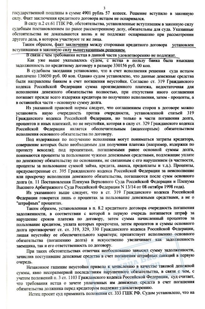 Исковые требования состояли в признании необоснованным завышения задолженности по кредиту и возврате переплаченных денег на кредитный счёт. В результате сумма уже переплаченных штрафов была снижена судом со 135 000 до 10 000 рублей (суммы округлены), а переплаченные 125 000 деньги были возвращены на кредитный счёт Т.Н. путём погашения основного долга.