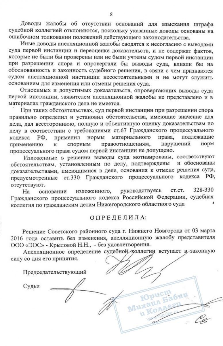 Кредитный юрист отстоял право клиентки на перерасчет долга. В результате её основной долг был уменьшен до 73 тыс.рублей, а коллекторское агентство "ЭОС" было вынуждено выплатить 7,5 тыс. руб. штрафа в пользу Б.И. за нарушение её прав.