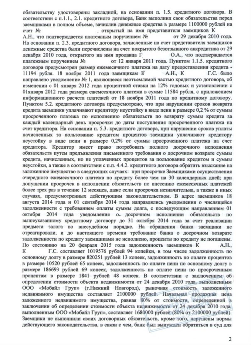 Несколько лет супруги К. выплачивали ипотеку, но начали допускать просрочки выплат - и банк потребовал досрочно вернуть весь оставшийся долг, а именно 1.020.000 руб. Естественно, такой суммой К. не обладали, и задолженность должна была быть возвращена путем ареста и продажи банком их жилплощади. При этом её стоимость была определена всего в 1.680.000 руб. То есть почти все деньги от квартиры должны были уйти на оплату долга.