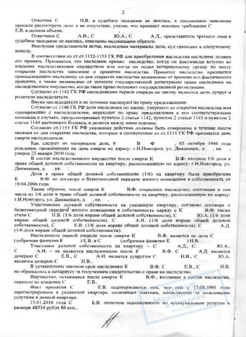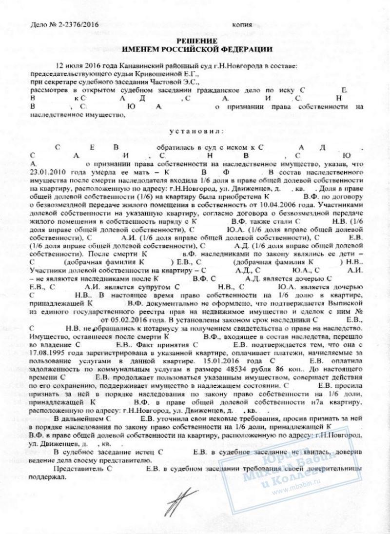 Сестра Е.С. и прочие совладельцы недвижимости не имели к ней претензий. В результате суд признал право собственности нашей клиентки на наследство даже без её присутствия на суде.
