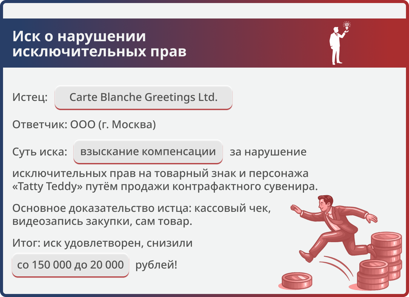 Истец требовал 150 000 руб. за нарушение прав на товарный знак и персонажа «Tatty Teddy». Юристы компании убедили суд в несоразмерности суммы, и компенсация снижена в 7,5 раз — до 20 000 руб.