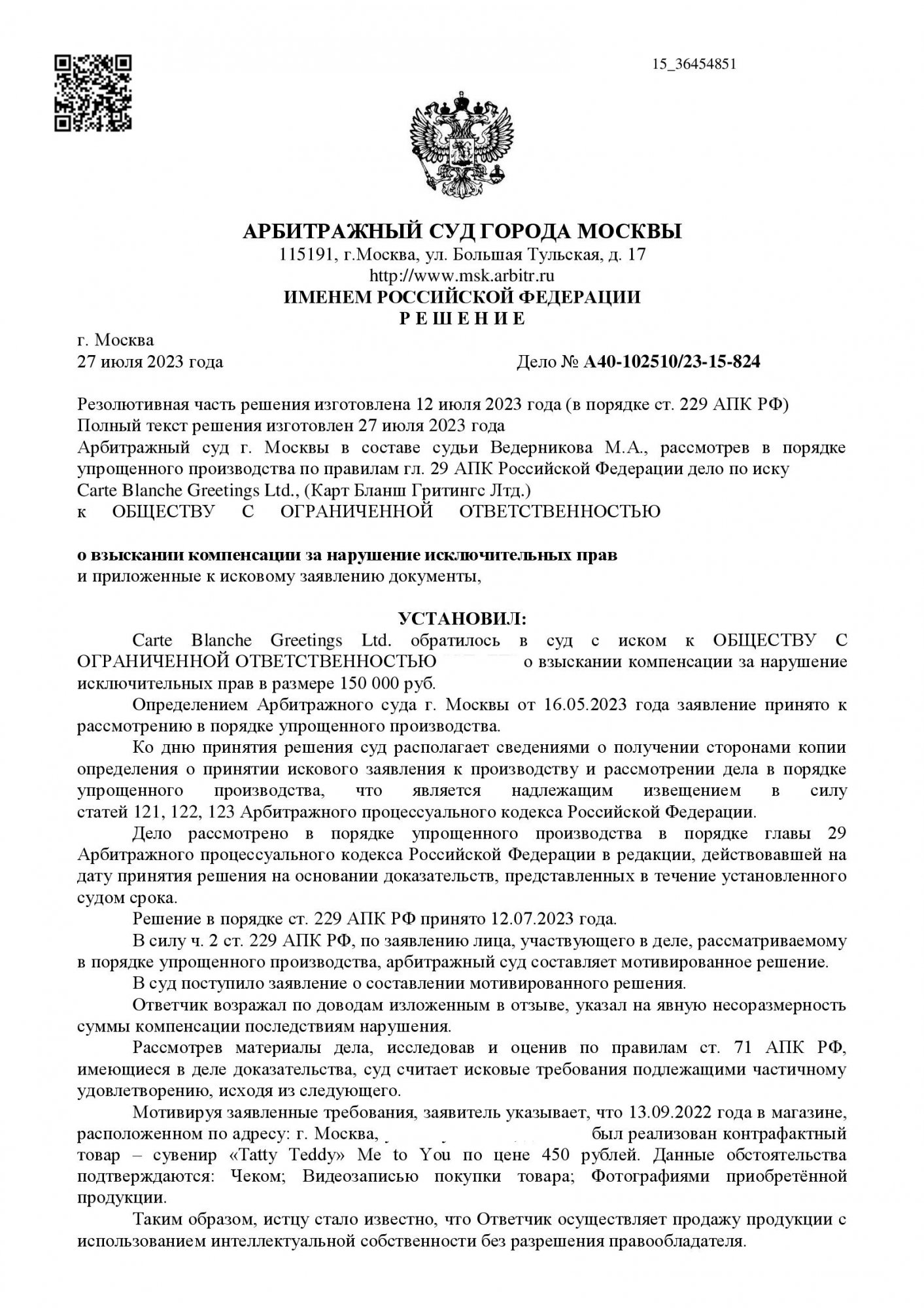 Истец (Carte Blanche Greetings Ltd.) обратился в суд с иском к ООО о взыскании 150 000 руб. компенсации за нарушение исключительных прав на товарный знак и произведение изобразительного искусства — персонажа «Медвежонок Tatty Teddy». Основание — продажа в магазине ответчика контрафактного сувенира по цене 450 руб. Ответчик представил отзыв, указав на несоразмерность заявленной суммы, и дело рассмотрено в порядке упрощённого производства.