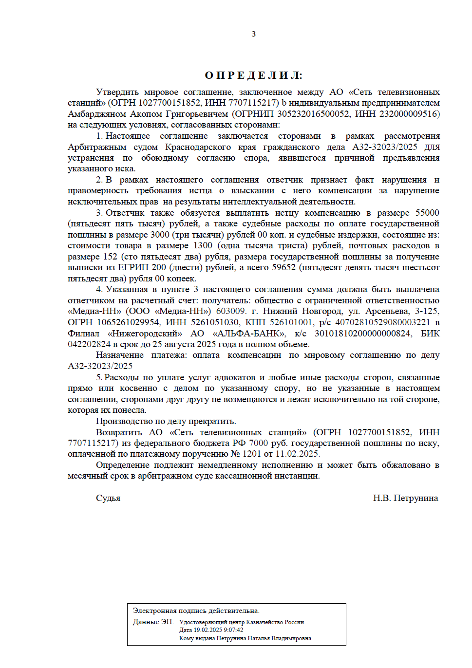 Арбитражный суд утвердил мировое соглашение, полностью прекратив производство по делу. Это юридически завершило конфликт.