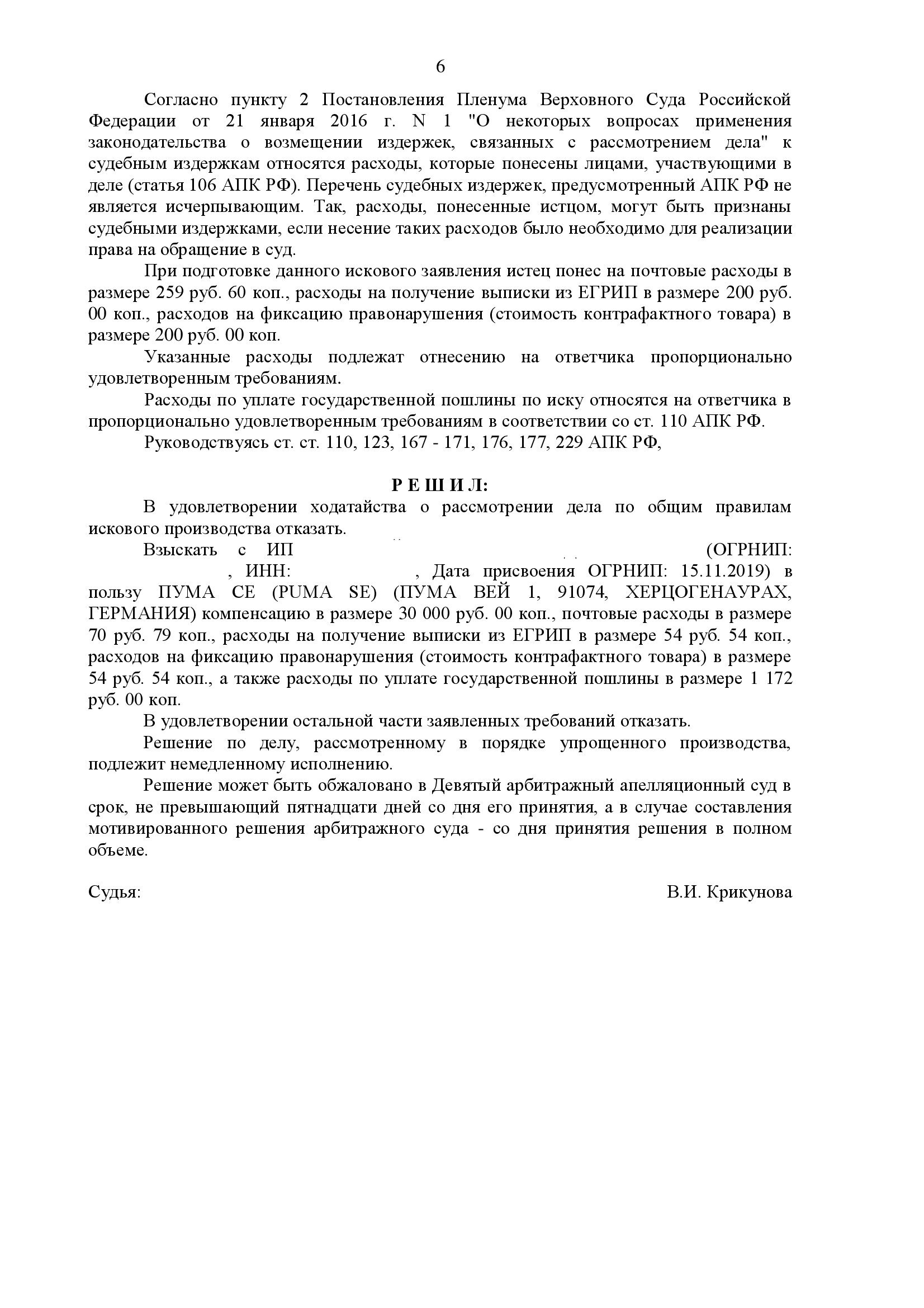 Снижение компенсации PUMA со 110 000 до 30 000 рублей за продажу контрафактного товара