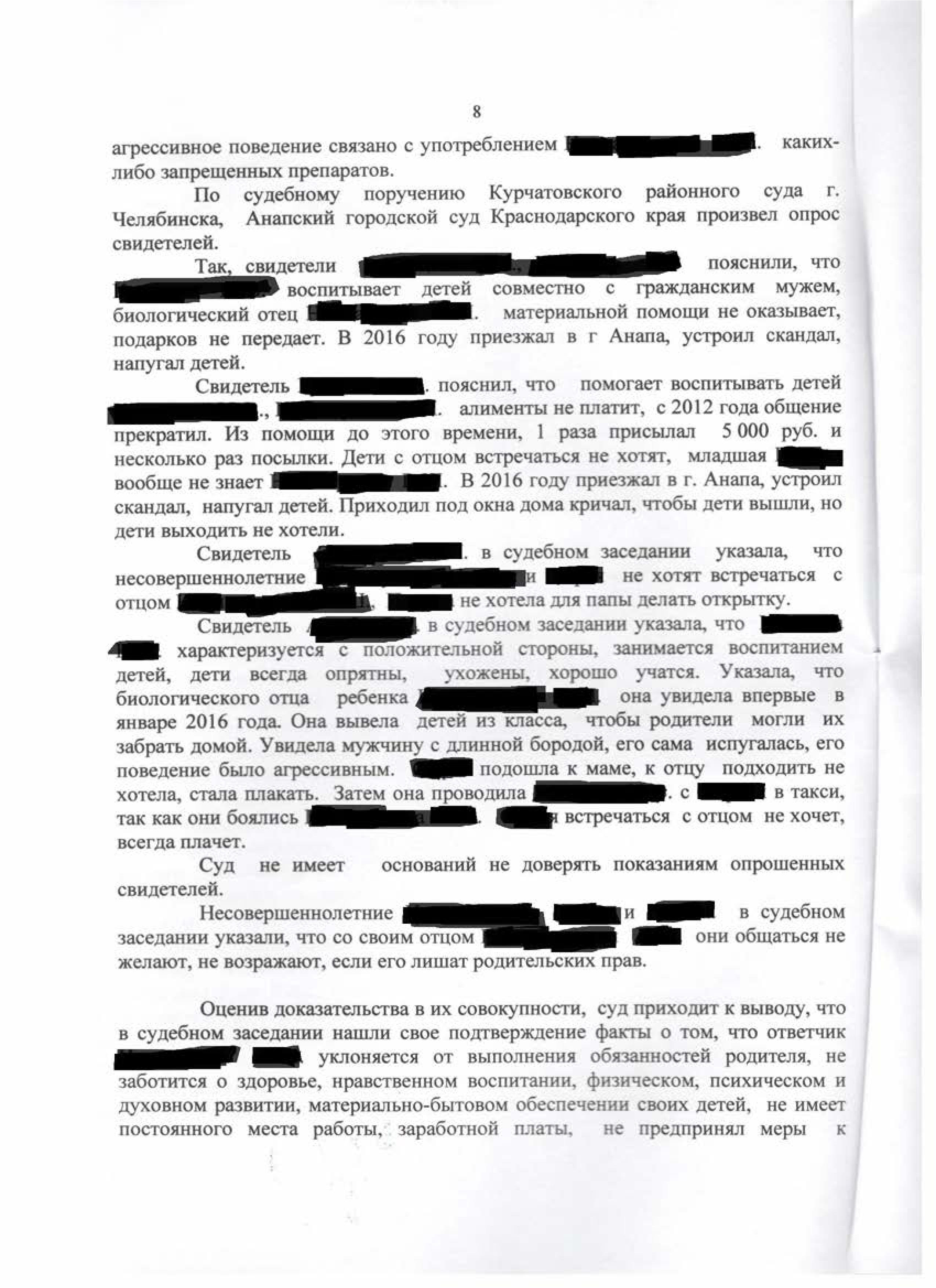 Юрист представлял интересы в данном деле и поддерживал исковые требования о лишении родительских прав и взыскании алиментов. Ответчик в свою очередь заявлял, что перечислял алименты, но с 2010 года после переезда в Анапу мать препятствует его общению с детьми. Материалами дела установлено, что отец приезжал в Анапу, устроил скандал, напугал детей, угрожал зарезать мать и выдать дочь замуж в 13 лет. Суд, рассмотрев все доводы сторон и показания свидетелей, принял решение о лишении отца родительских прав.