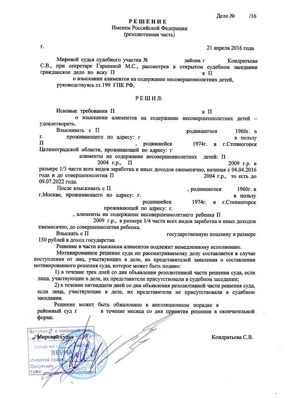Изучив поданные материалы, судья принял решение в полной мере удовлетворить заявление истицы, взыскав с ответчика, гражданина П., алименты на содержание малолетних детей в следующем размере: