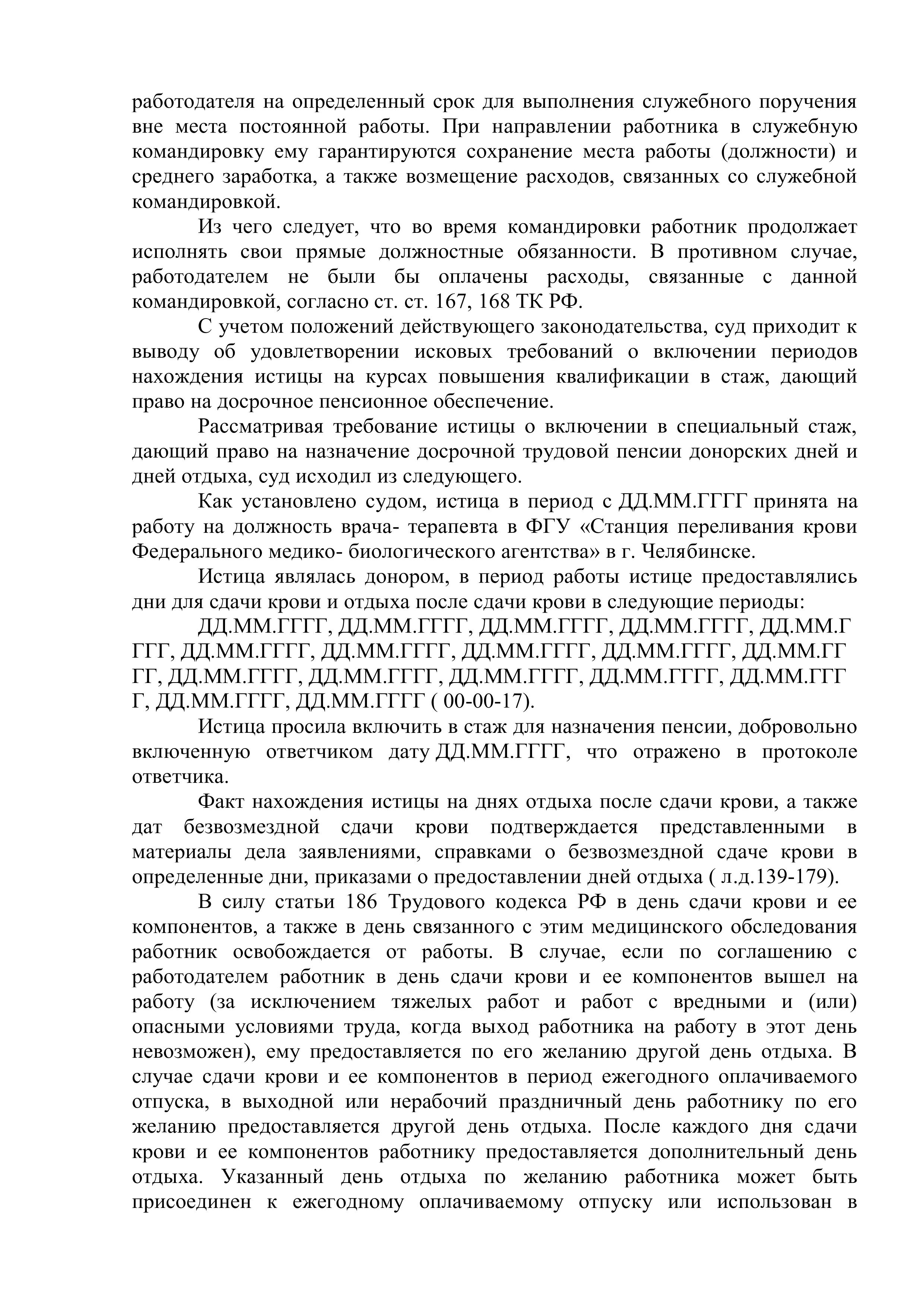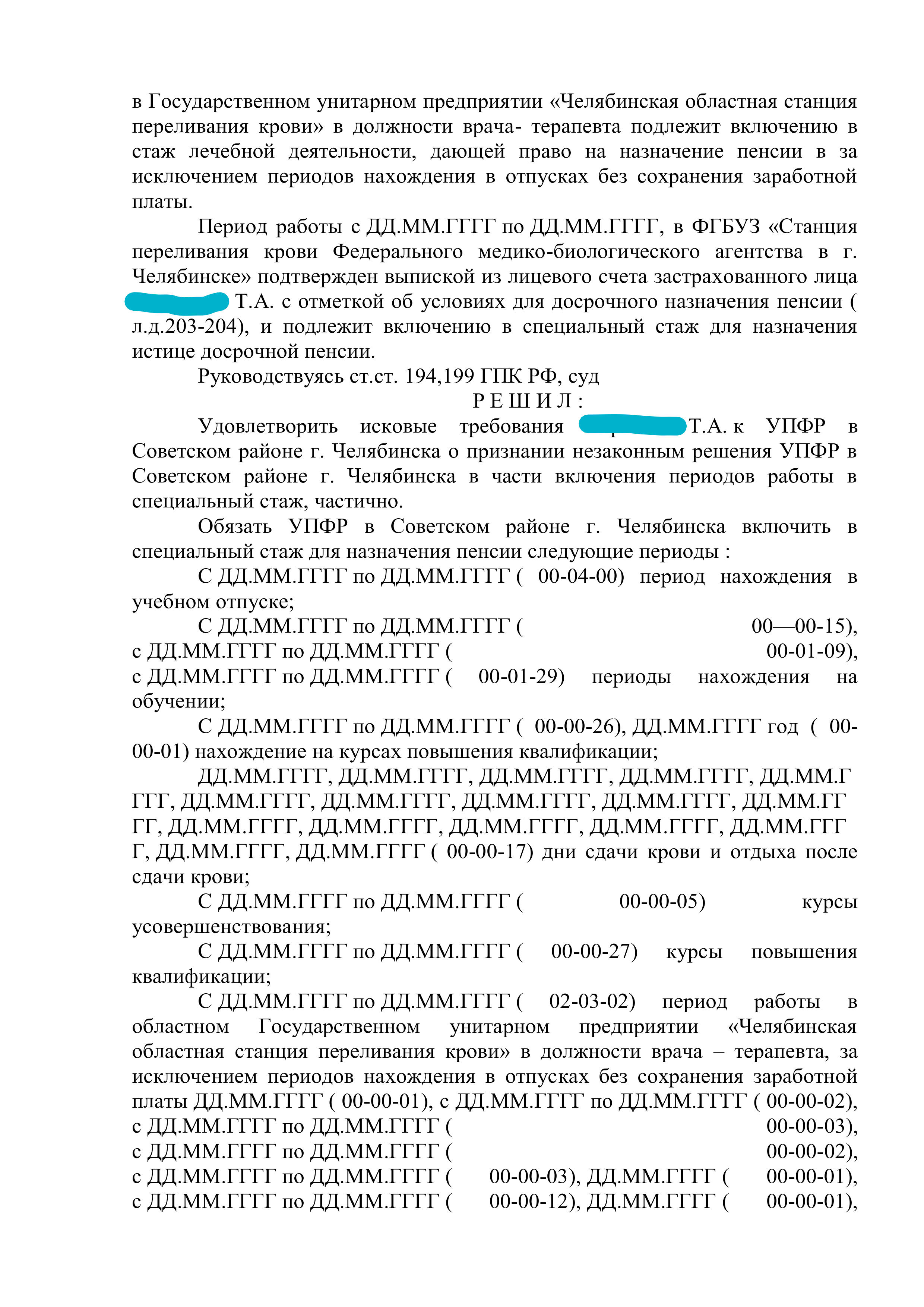 Юрист "Оригинального решения" подготовил все необходимые документы, доказывающие суду то, что УПФР незаконно не включил в специальный стаж для назначения досрочной пенсии периоды работы, в сумме составляющие более 26 месяцев. Также, благодаря проделанной работе, удалось убедить суд включить в специальный стаж дни отдыха, после сдачи донорской крови.