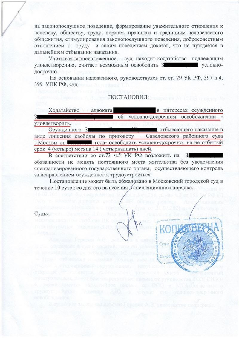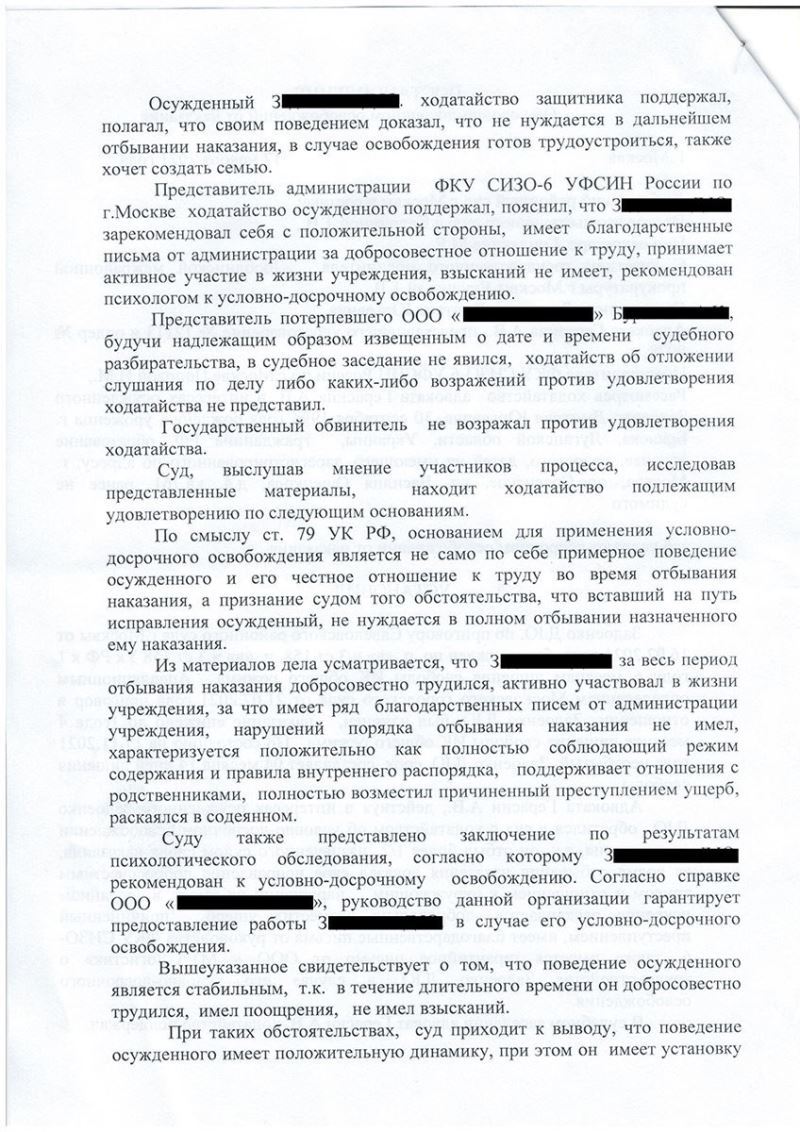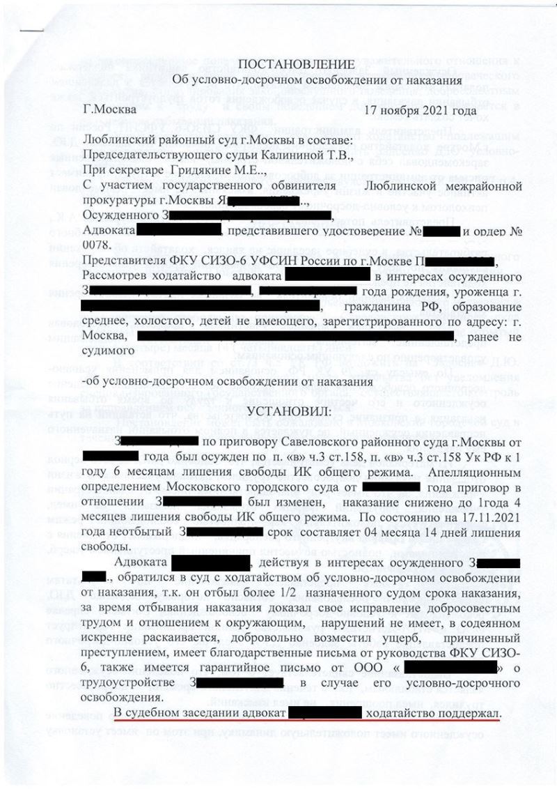Адвокат собрал необходимые документы, в том числе из СИЗО, в котором на тот момент подзащитный отбывал наказание, получил гарантийное письмо о трудоустройстве клиента, в случае его освобождения, подготовил мотивированное ходатайство и подал его в суд, поскольку З. отбыл более половины назначенного судом срока наказания.