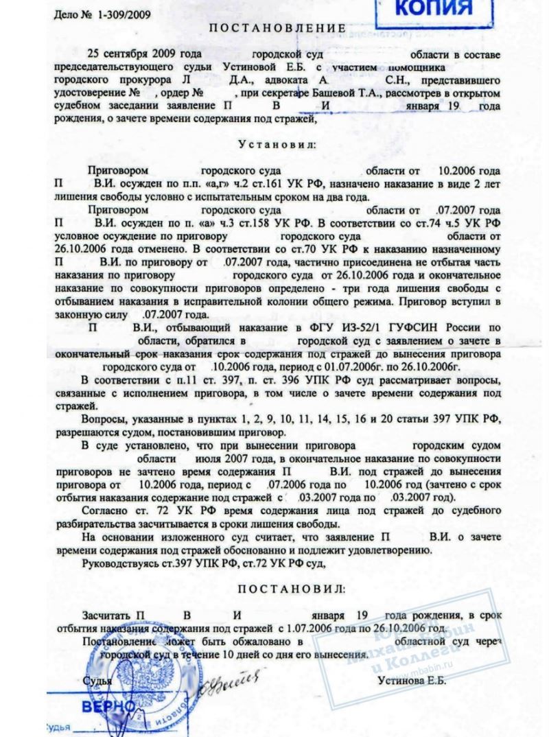 Однако суд не учел периода пребывания П. под стражей до суда в 2006 году. Адвокатами нашей компании было подготовлено компетентное обращение в суд, результатом чего стало сокращение срока наказания почти на 4 месяца.