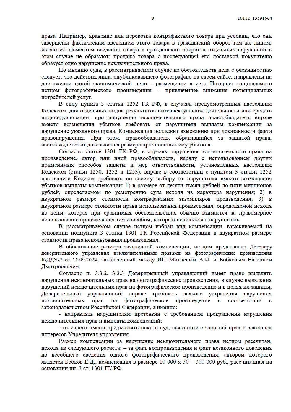 Размер компенсации был рассчитан согласно пп. 3 п. 1 ст. 1301 ГК РФ — в двукратном размере стоимости права использования, что обосновало заявленную сумму в 300 000 рублей.