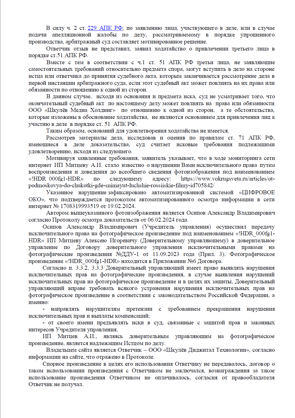 Арбитражный суд города Москвы полностью удовлетворил исковые требования. С ООО «Шкулёв Диджитал Технологии» взыскано: