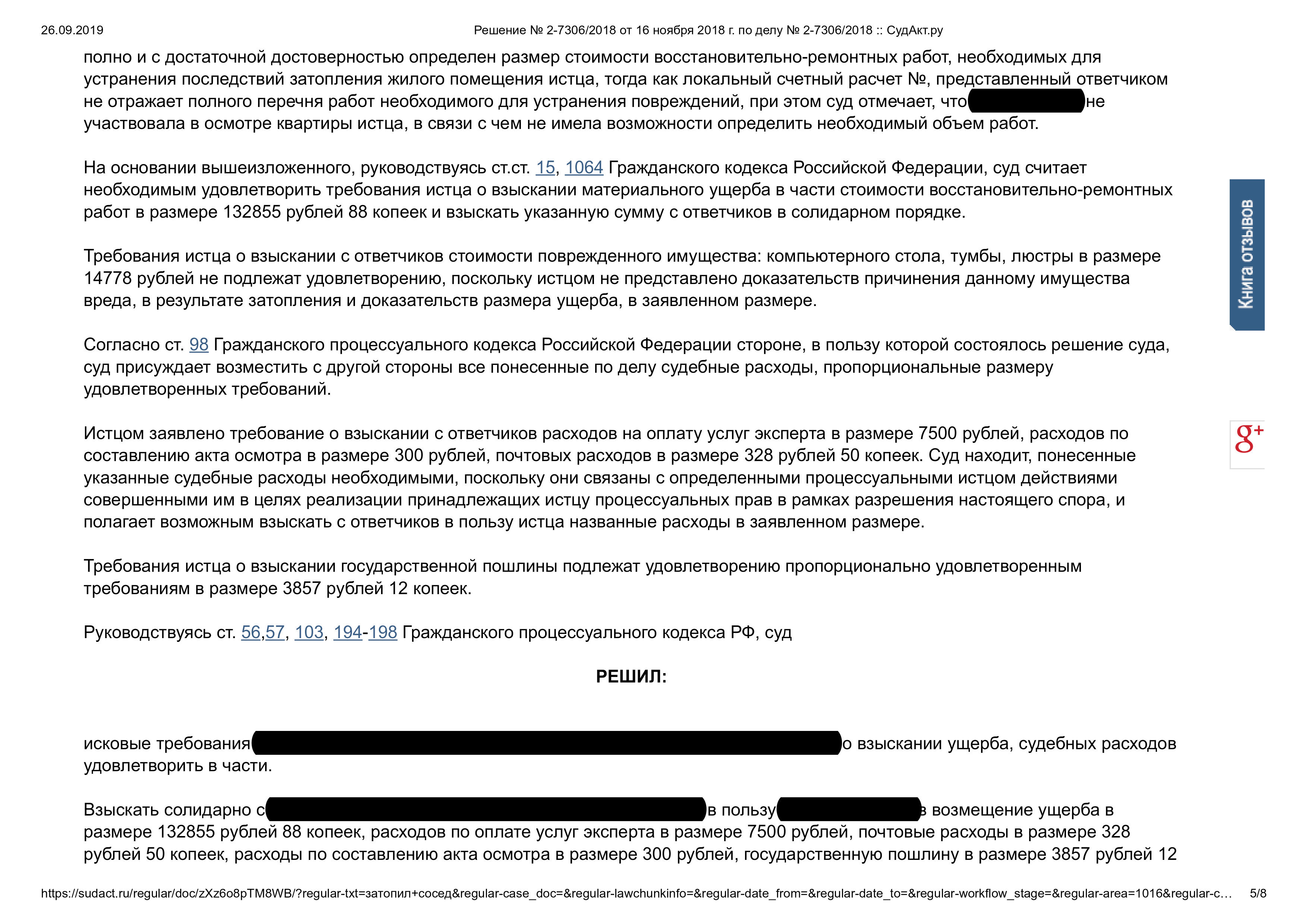 Возместить ущерб, причиненного заливом жилого помещения
